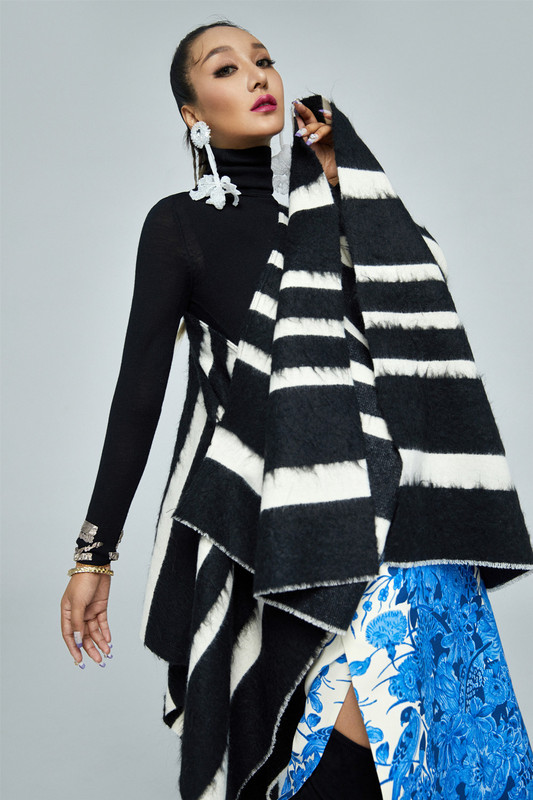 近日,旺姆曝光了一组时尚写真大片。照片中旺姆身着黑色高领针织打底衫,搭配蓝白色青花瓷裹臀长裙,加上超大黑白条纹围巾当做斜肩外套,加上夸张的耳饰,整体搭配既有中国风的元素又时尚感满满。被称为&ldquo